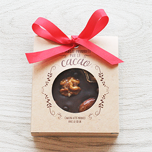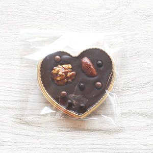 自家製チョコレートをハート型のパレツトに流し込みピーカンナッツやアーモンドを飾りました。